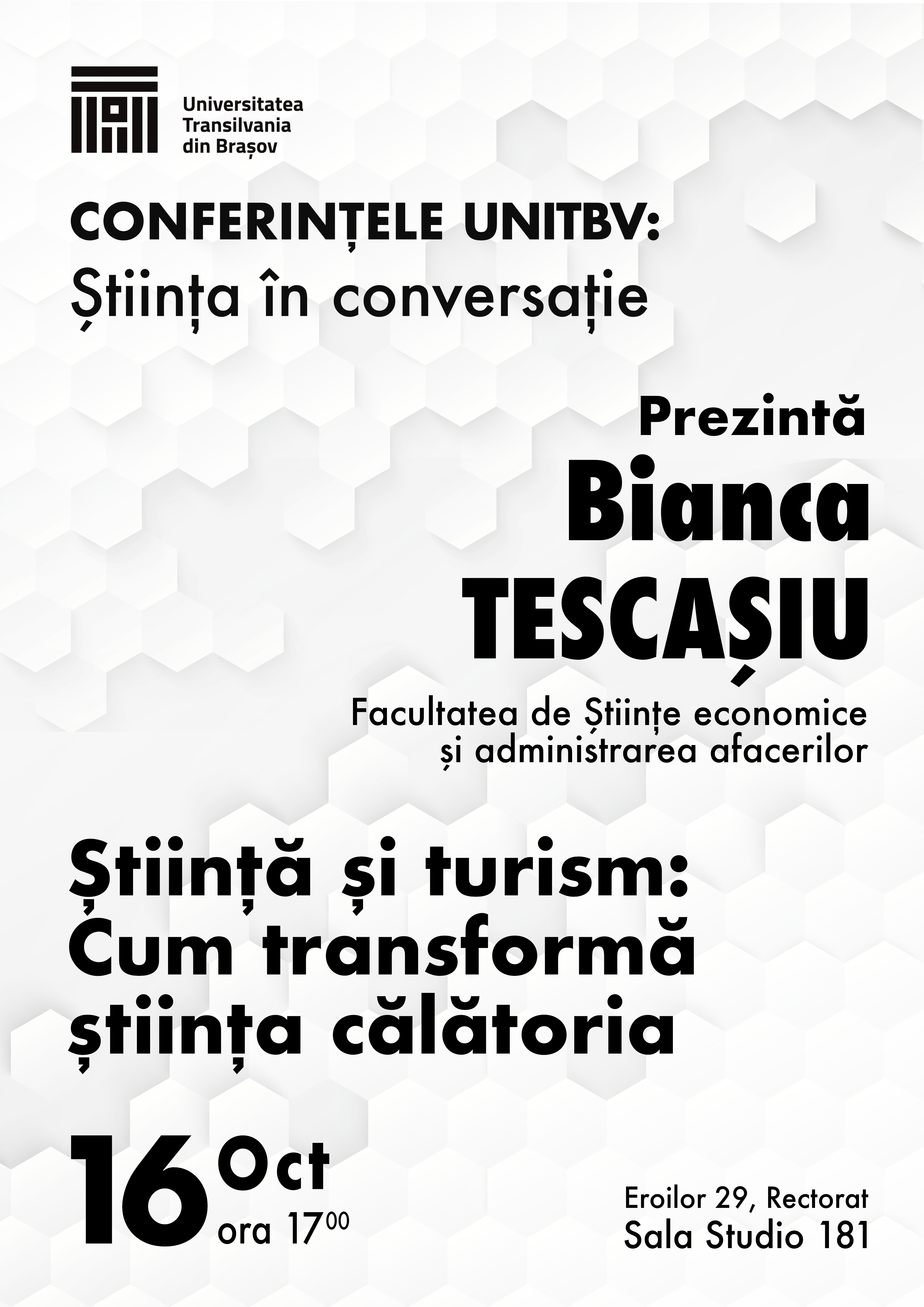 Universitatea Transilvania din Brașov continuă seria Conferințelor UNITBV: Știința în conversație. Invitata celei de-a șasea ediții este Bianca Tescașiu, profesor la Facultatea de Științe economice și administrarea afacerilor, care vă așteaptă la o dezbatere interesantă cu tema „Știință și turism: cum transformă știința călătoria”.