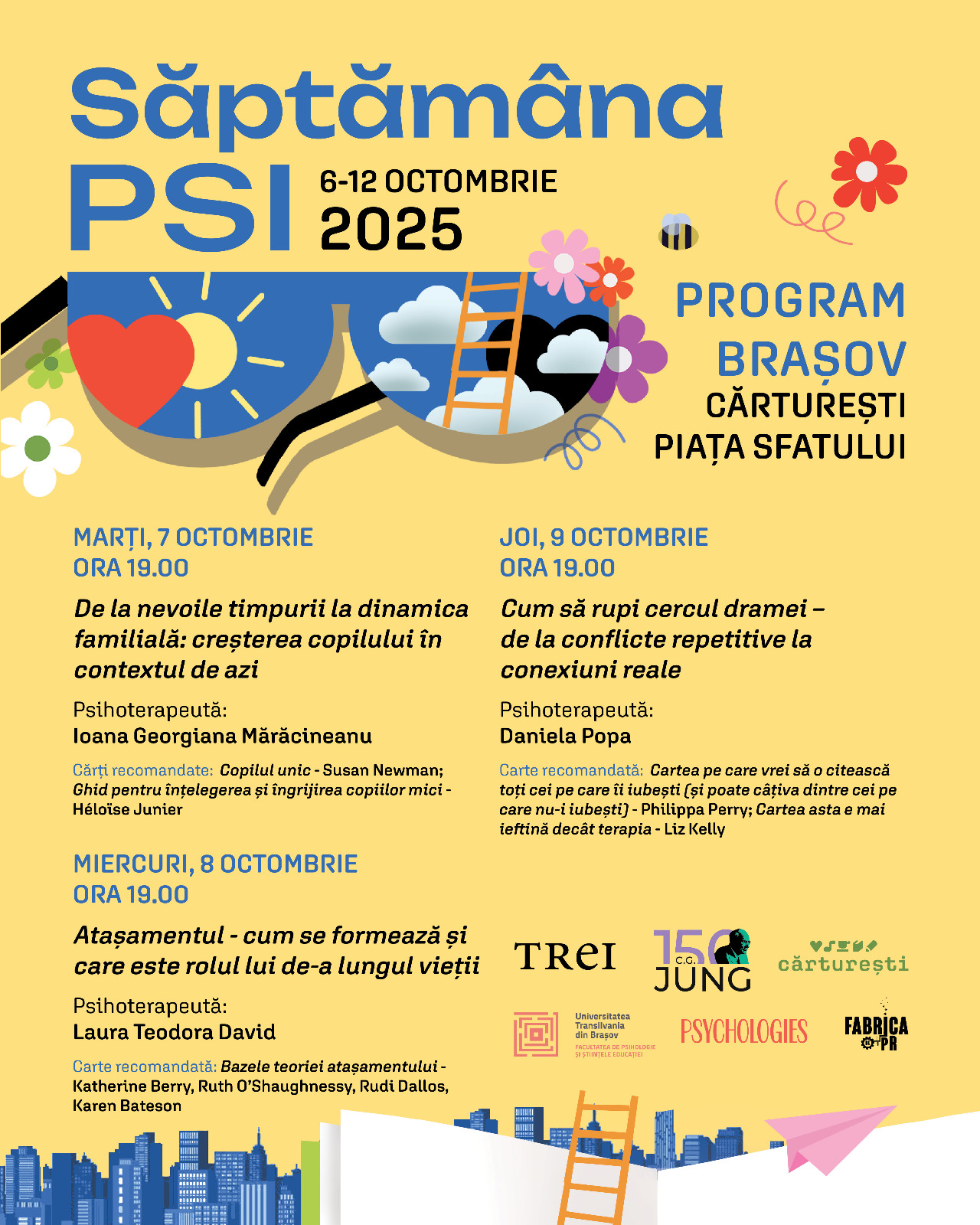 Facultatea de Psihologie și Științele Educației, în colaborare cu Librăriile Cărturești și Editura Trei, vă așteaptă la ediția de toamnă a evenimentului Săptămâna PSI, care va cuprinde o serie de prezentări și dezbateri pe tema vieții de cuplu, atașamentului și sănătății relației.