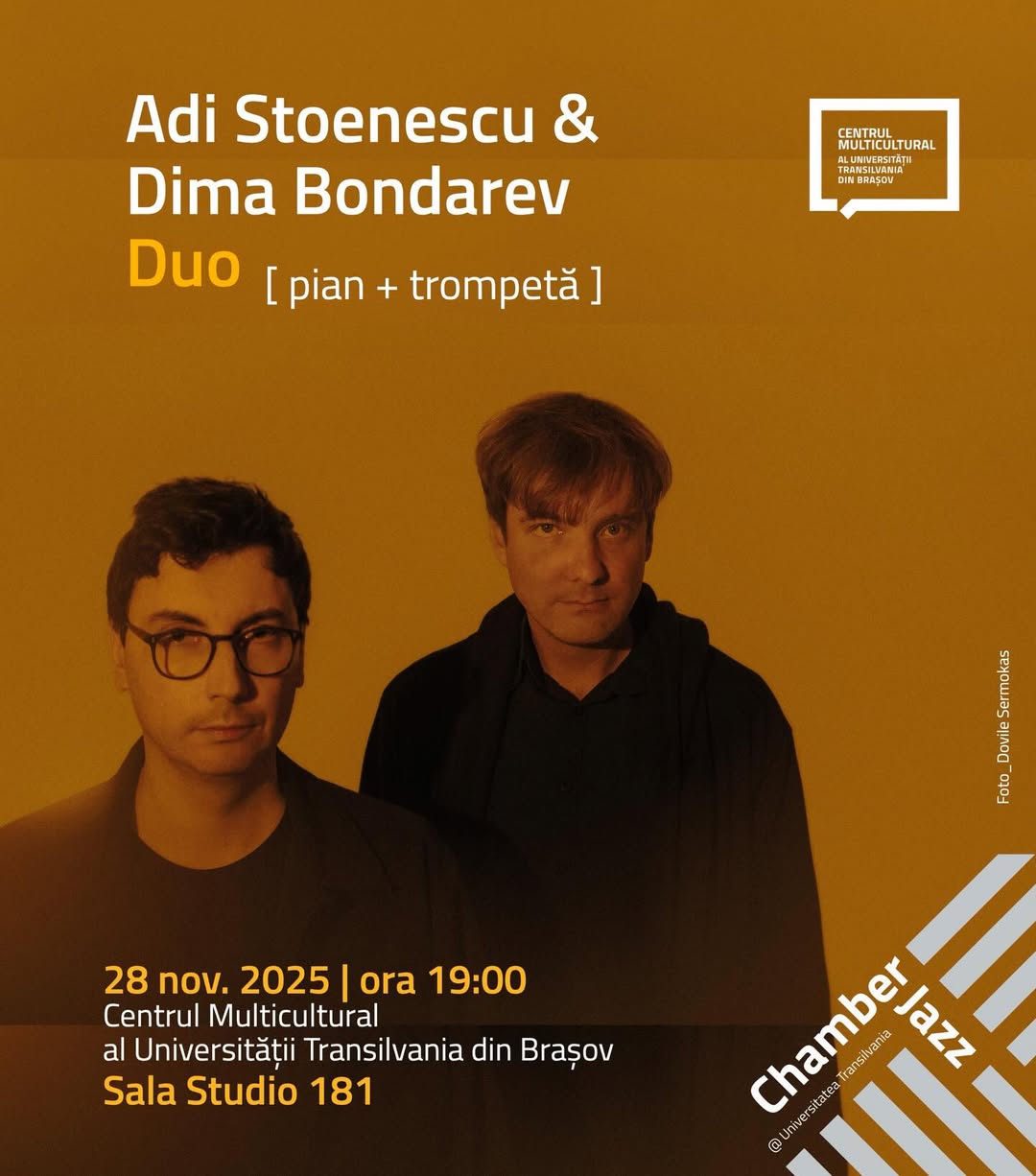 Un nou concert din cadrul programului cultural Chamber Jazz @ Universitatea Transilvania îi aduce în fața publicului brașovean pe pianistul Adi Stoenescu și pe trompetistul Dima Bondarev într-o explorare a dialogului liber dintre lirismul pianului acustic și expresivitatea caldă a trompetei.