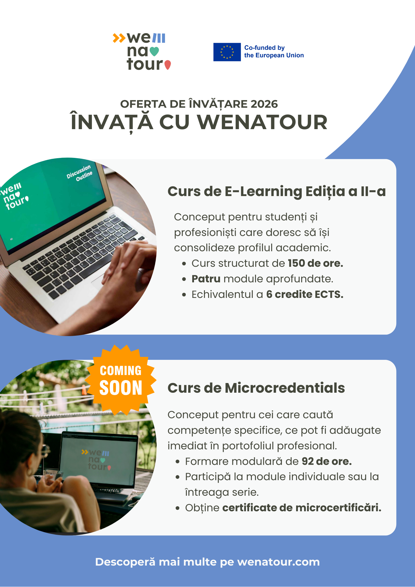 Oferta WeNaTour pentru anul 2026 este organizată în jurul a două cursuri complementare, fiecare fiind adaptat unui public specific și unui obiectiv de învățare bine definit: un curs de e-learning (ediția a doua) cu recunoaștere academică, și un curs de micro-certificare, ambele asigurând excelența profesională în turismul sustenabil și managementul destinațiilor.