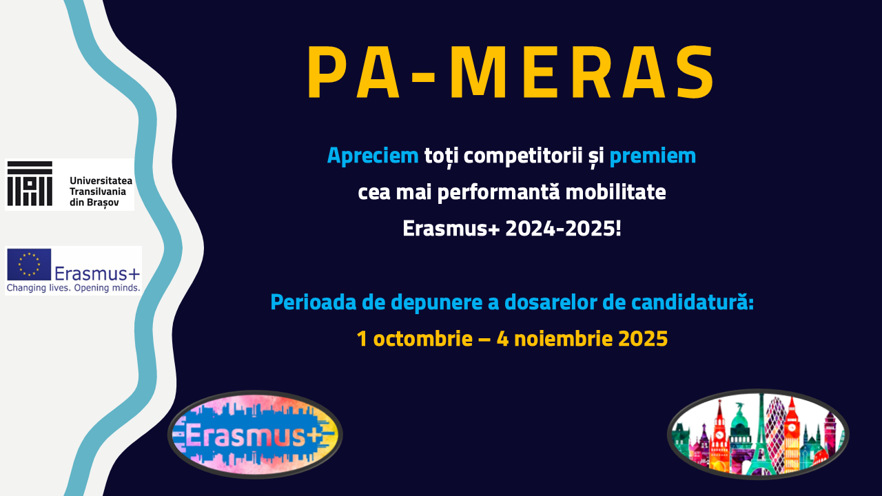 Studenții Universității Transilvania din Brașov care au beneficiat de mobilitate de lungă durată Erasmus+ pe parcursul anului universitar 2024-2025, sunt invitați să participe la Programul „PREMIUL ANULUI. MOBILITATEA ERASMUS+” (PA-MERAS), prin care se premiază cea mai performantă mobilitate de studiu sau de practică Erasmus+.
