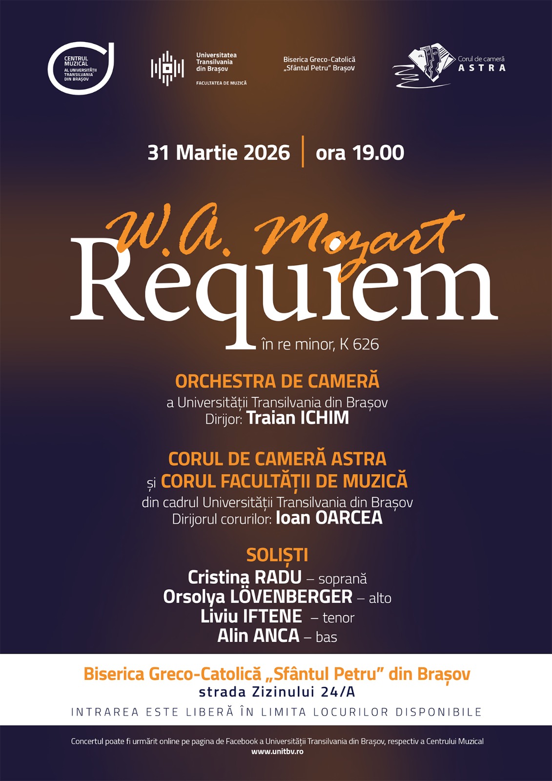 Centrul Muzical al Universității Transilvania vă invită să luați parte la un concert deosebit, dedicat perioadei premergătoare sărbătorii Învierii Domnului. Lucrarea Requiem in re minor, K 626, de W. A. Mozart va putea fi ascultată într-o interpretare de excepție, care reunește soliști vocali de anvergură națională și internațională: Cristina Radu (sopran), Orsolya Lövenberger (alto), Liviu Iftene (tenor) și Alin Anca (bas; Hamburg, Germania). Le vor fi alături Corul de Cameră ASTRA și Corul Facultății de Muzică, dirijate de Prof. dr. habil. Ioan Oarcea și Orchestra de Cameră a Universității Transilvania din Brașov. Întregul aparat interpretativ va fi dirijat de Conf. dr. Traian Ichim.