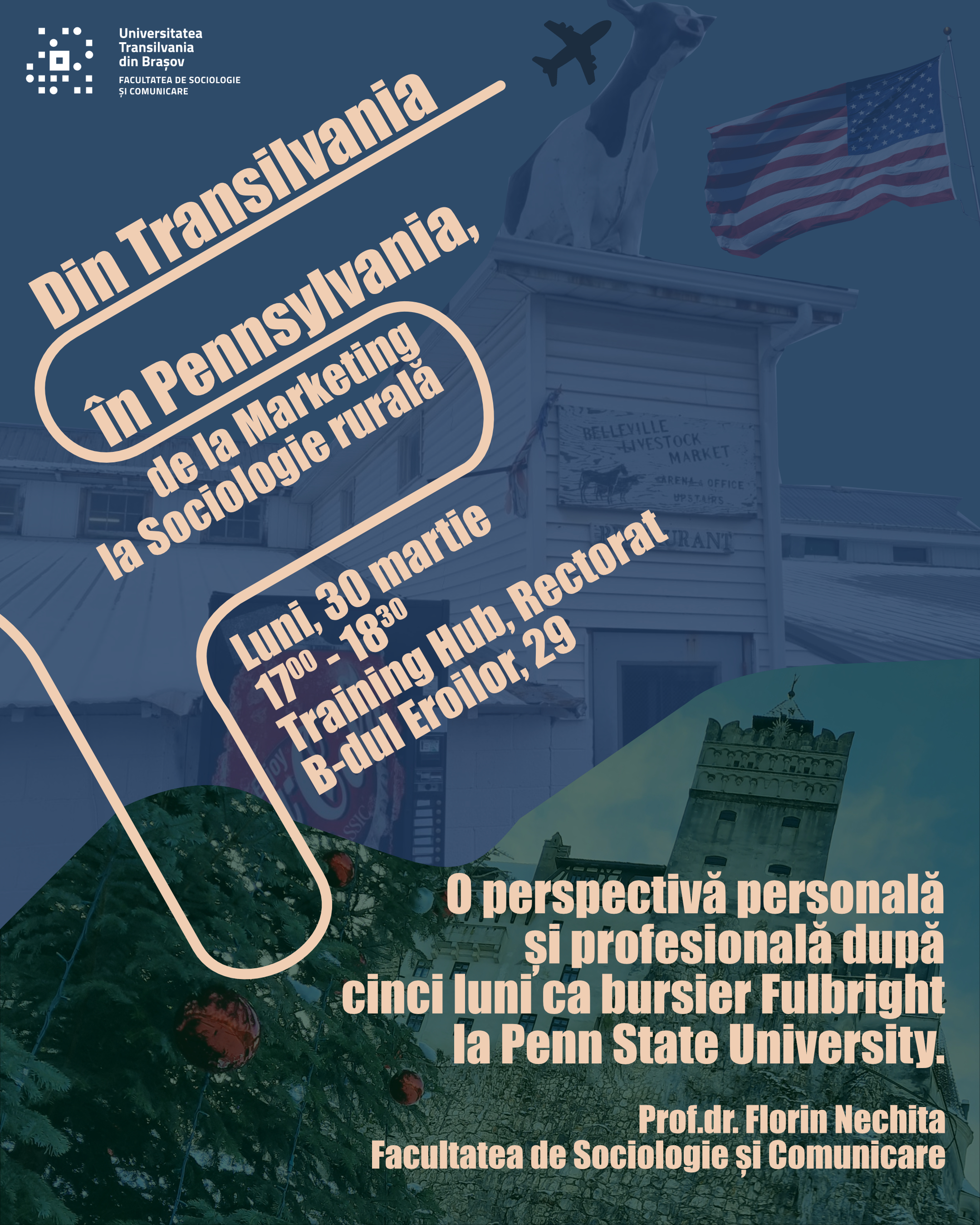 Luni, 30 martie, de la ora 17:00, în Training HUB (Rectorat), prof. dr. Florin Nechita, de la Facultatea de Sociologie și Comunicare, va susține o prezentare publică despre experiența sa de cinci luni în Statele Unite, în calitate de bursier Fulbright la Penn State University.
