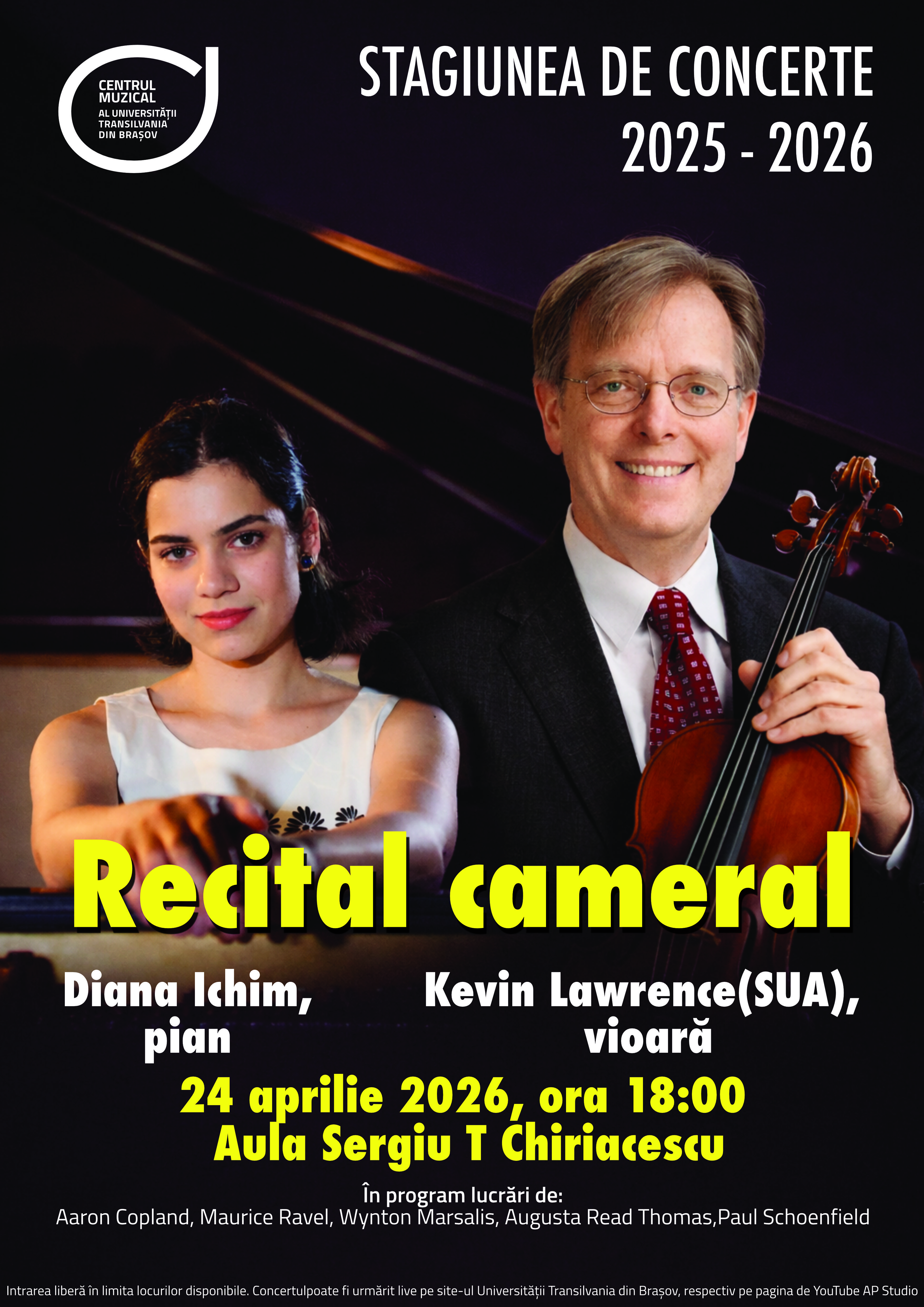 Centrul Muzical al Universității Transilvania din Brașov are deosebita plăcere de a vă invita la un concert de excepție, ce îl aduce în prim-plan pe violonistul american Kevin Lawrence – Fulbright Scholar, alături de pianista Diana Ichim.
